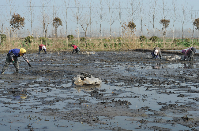 雖已初春,乍暖還寒。春節(jié)過后,淮海農(nóng)場愛蓮苑水生花卉基地里就是一派忙碌。每天,農(nóng)場下崗職工陸寶珍正常與其他10多名員工一起,頭戴著圍巾,穿著水褲,手持小鍬,拖著塑料薄膜,在睡蓮池中采摘睡蓮的根芽。等采集到一定量后,就按規(guī)格進(jìn)行分撿、計數(shù)打包,隨即按公司訂單需求,銷往全國各地甚至從海空渠道托運到國外市場。