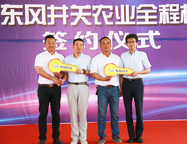 胡兆輝、盧鋒共同為新洋分公司、東辛分公司農(nóng)業(yè)全程機(jī)械化示范園授牌。蘇志富、葉常青分別代表雙方企業(yè)簽約。丸尾、詹黎明分別為用戶代表頒發(fā)交機(jī)鑰匙。