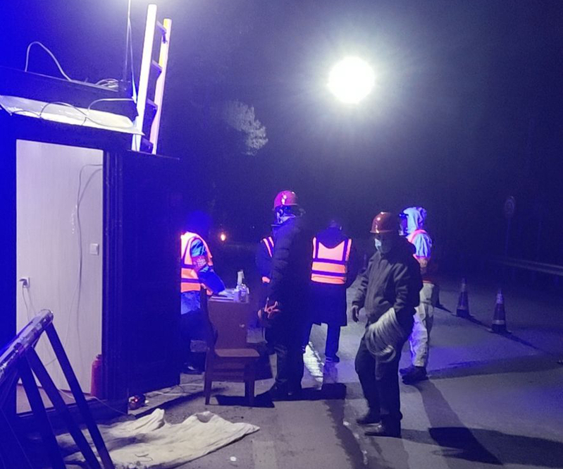 經(jīng)過2個(gè)多小時(shí)的應(yīng)急處置、奔赴、安裝。給夜幕下的防疫檢查點(diǎn),更加安全、明亮。