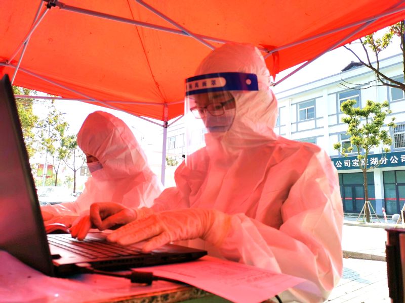 在寶應湖農(nóng)場固定核酸檢測點,有這樣一群人,他們身穿白色防護服忙著測溫掃碼、維持秩序、采集信息……,“您好請掃一下場所碼,近期沒有外出吧?”“您好,我給您測量一下體溫”“請大家保持一米線,核酸做完及時離開,不交談不聚集”一句句叮囑傳遞著疫情期間的濃濃關懷,在大家的耳畔久久回蕩。