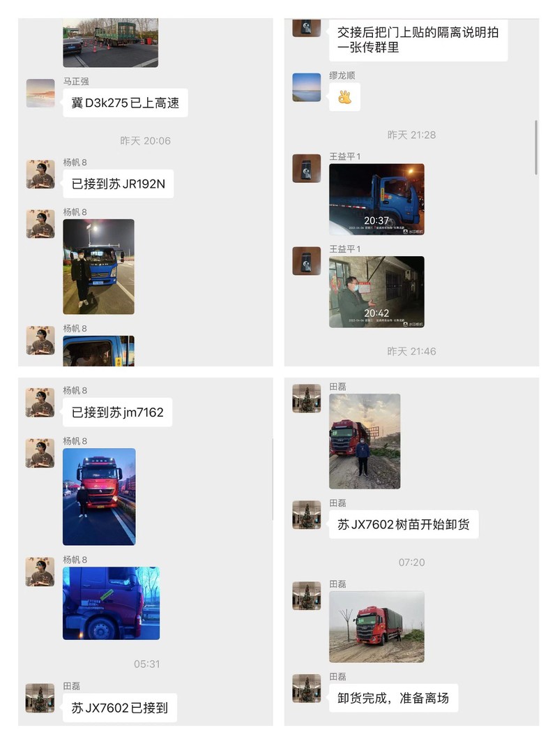 “冀D3k275已上高速”“已接到蘇JR192N”“空車回場,行程碼無星號,居家隔離”“蘇JX7602樹苗開始卸貨”……弶港農(nóng)場“疫”線黨員突擊隊微信群里的工作匯報內(nèi)容簡短,工作流程圖像清晰,值班人員和應(yīng)急小組24小時在線,全力為場域內(nèi)企業(yè)企業(yè)穩(wěn)產(chǎn)保供保駕護航。