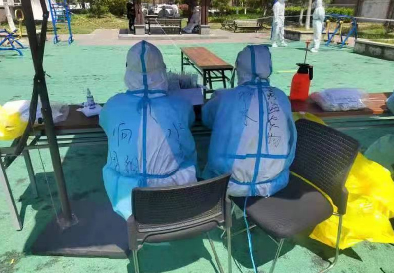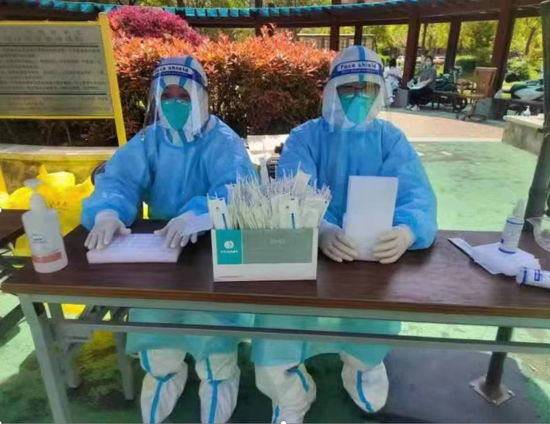 一日為醫(yī),終生不棄。張紅主動擔當國企的責任與使命。4月4日凌晨6點趕到上海浦東新區(qū)川沙鎮(zhèn)社區(qū),醫(yī)務人員相互之間穿戴好防護服、護目鏡、口罩、鞋套、手套、帽子,并進行嚴而又嚴、實而又實、細而又細的防護檢查,沒有休息片刻就立即投入核酸采集的戰(zhàn)斗中。浦東新區(qū)疫情形勢嚴峻,面對被感染的風險和高負荷的工作壓力,張紅有條不紊地進行核酸檢測采集工作。這是上海浦東新區(qū)全民核酸檢測第三天,也是核酸采集壓力最大的一天,采集現(xiàn)場的布置、醫(yī)護人員與新設備的磨合、工作人員與社區(qū)、居委會人員的協(xié)調(diào)、居民采集核酸的急迫心情等,多重矛盾交織在一起。對此,張紅和其他醫(yī)務人員爭分奪秒抓緊進行核酸檢測,炎熱的天氣、高強度的工作加之憋悶的防護裝備,衣衫不停的被汗水浸濕,再被身體烘干,再浸濕……臉部深深的壓痕成了標配,人在汗水“泡”著里工作成了常態(tài)……到了晚上,為了緩解上海市疫情防控壓力,張紅又和同事們一起乘上大客車連夜返回到響水,趕到響水時已是4月5日凌晨1點多了。第一趟完成核酸檢測任務連續(xù)30個小時不吃不喝,張紅不言苦、不叫累。她堅持以高度的責任心為前來做核酸檢測的人員提供服務,她用真情和愛心譜寫著平凡而動人的天使之歌!