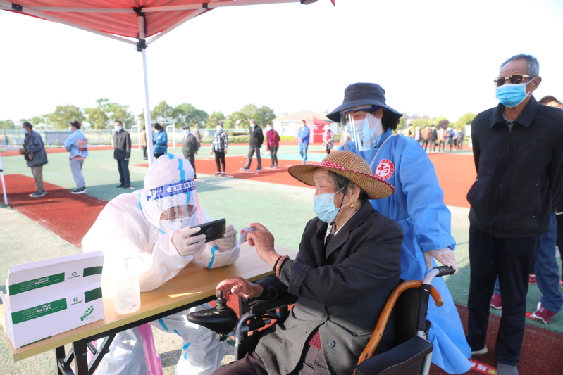 “請(qǐng)從這邊走!”轉(zhuǎn)業(yè)軍人、青年黨員孫強(qiáng),標(biāo)準(zhǔn)軍人站姿導(dǎo)引著檢測(cè)居民有序進(jìn)入,成為檢測(cè)中的一道風(fēng)景。青年黨員趙珊、沈燕是一對(duì)好姐妹,由于連續(xù)的叫喊讓沈燕的嗓子嘶啞,今天她倆特意交換的分工?!斑@隊(duì)人少,請(qǐng)到這隊(duì)來!”接過好姐妹手中的大喇叭,趙珊大聲招呼著,將進(jìn)入檢測(cè)區(qū)的居民有序分流到3個(gè)采樣區(qū)。“你們?cè)谶@里等我會(huì)兒,我先幫你們登記?!?/span>換成維護(hù)秩序后,沈燕時(shí)刻關(guān)注著檢測(cè)的人群。70多歲的王奶奶家住劉圩小區(qū),獨(dú)自一個(gè)坐著電動(dòng)輪椅來到劉圩居委會(huì)核酸采樣點(diǎn)。沈燕見狀立刻上前引導(dǎo)她來到綠色通道,熱情地幫助她登記信息。不到5分鐘,王奶奶就完成了采樣。沈燕又小心地把她帶到了檢測(cè)出口。細(xì)心的黨員孫偉,在檢測(cè)中發(fā)現(xiàn)有不少行動(dòng)不便的老人。今天他提前借來了一輛輪椅,看到年老體邁的老人,他就主動(dòng)迎上去,把老人推進(jìn)檢測(cè)綠色通道,從掃碼測(cè)溫到登記采樣,再到出口離開,最后把老人安全地交到老人家人手中。