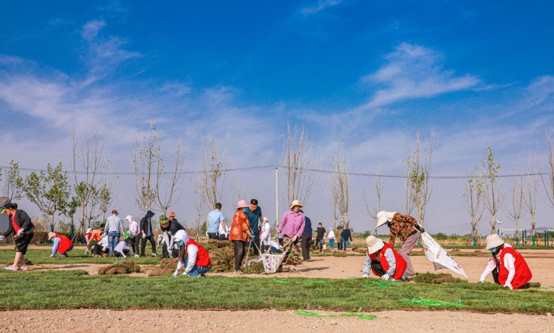 “草皮之間要留有空隙,讓它的根可以生長,大家鋪的時(shí)候注意一些。”“這邊的草皮馬上就要鋪完了,快讓運(yùn)送車再裝一車草皮過來。”……
