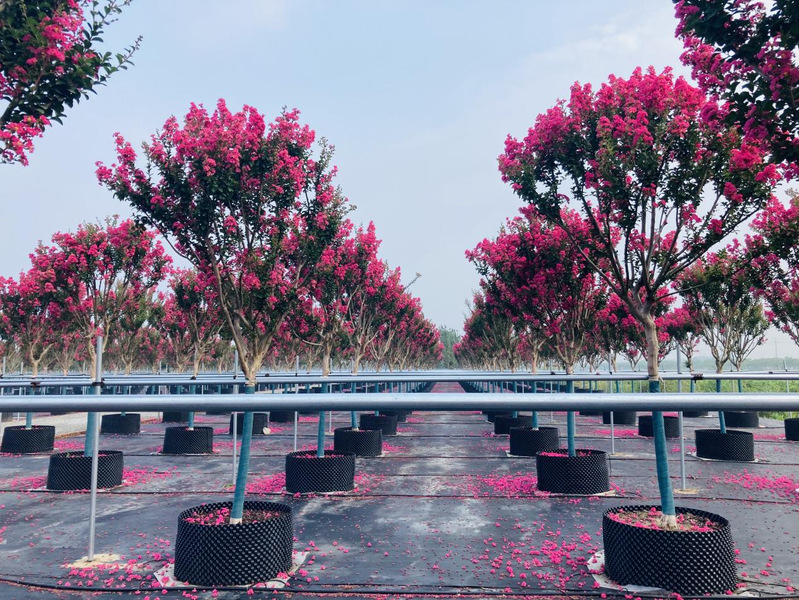 新洋林業(yè)公司容器苗三期當下正是一幅花開似霞的盛景,紫薇花團團簇簇掛滿枝頭,相當奪目。拳頭產(chǎn)品“四川紅”紫薇是農(nóng)場公司黨委和林業(yè)公司4月份頂著疫情的壓力,積極爭取引進的產(chǎn)品,到了7月份便成為了附近居民的網(wǎng)紅打卡產(chǎn)品,獲得了居民們的一致好評和稱贊。其花期極長,從6月一直持續(xù)到10月,宋代楊萬里贊曰:“誰道花無紅百日,紫薇常放半年花?!泵鞔ピ娫疲骸白限遍_最久,爛漫十旬期。”因此,紫薇也有“百日紅”之稱。