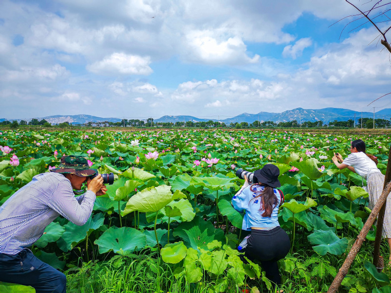 市區(qū)為“荷”而來(lái)的游客穿行在荷田之中,邊聞著沁人的花香,邊用攝影設(shè)備興致勃勃地拍照,大家不斷地調(diào)整角度、尋找機(jī)位,只為拍攝出荷花最傲人的身姿。