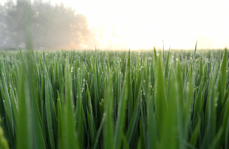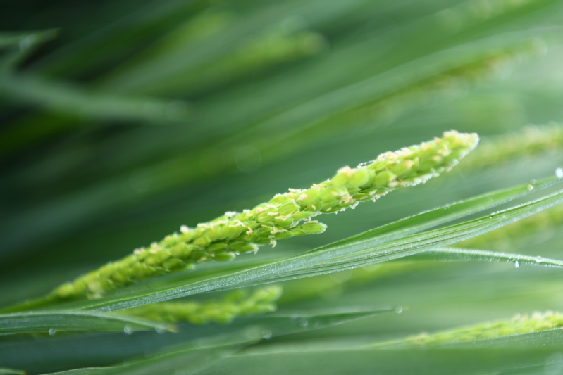 陽光下,霧氣散,空氣中彌漫著清新的稻花香。俯瞰蔥綠的稻田,如一條條綠絲帶整齊排列。晶瑩的晨露凝結在青翠的秧苗上,猶如給稻田蒙上了一層剔透的面紗。剛抽出的稻穗上,有白色的稻花點點,隨著稻穗一起隨風輕舞飛揚。小蜘蛛也趕來湊個熱鬧,在枝葉上織起了“秋的毛衣”。