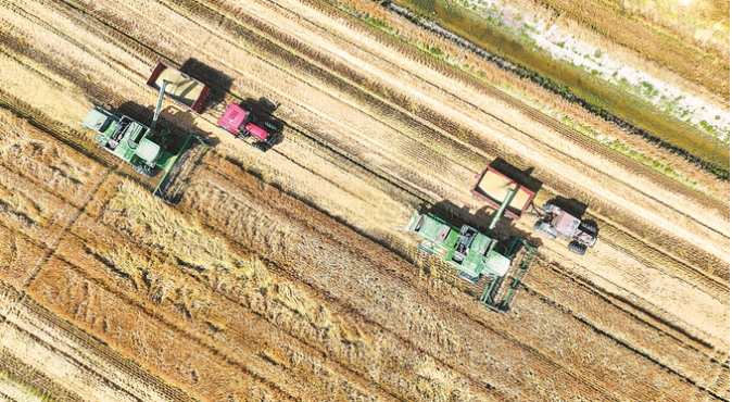 5月22日,大型聯(lián)合收割機(jī)駛?cè)肷潢柨h新洋農(nóng)場新中生產(chǎn)區(qū)13大隊(duì)的高標(biāo)準(zhǔn)農(nóng)田,對(duì)成熟的大麥開展機(jī)收作業(yè),開啟了夏收“第一鐮”。 張偉生 攝 (視覺江蘇網(wǎng)供圖)