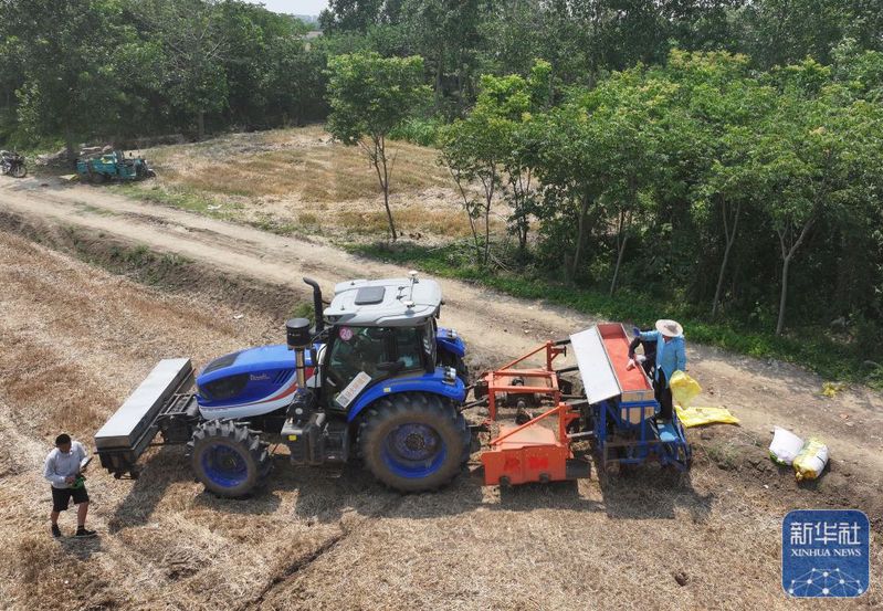 5月28日,揚州大學研制的“九合一”稻麥耕播機在三河農(nóng)場播稻種(無人機照片)。新華社記者 季春鵬 攝