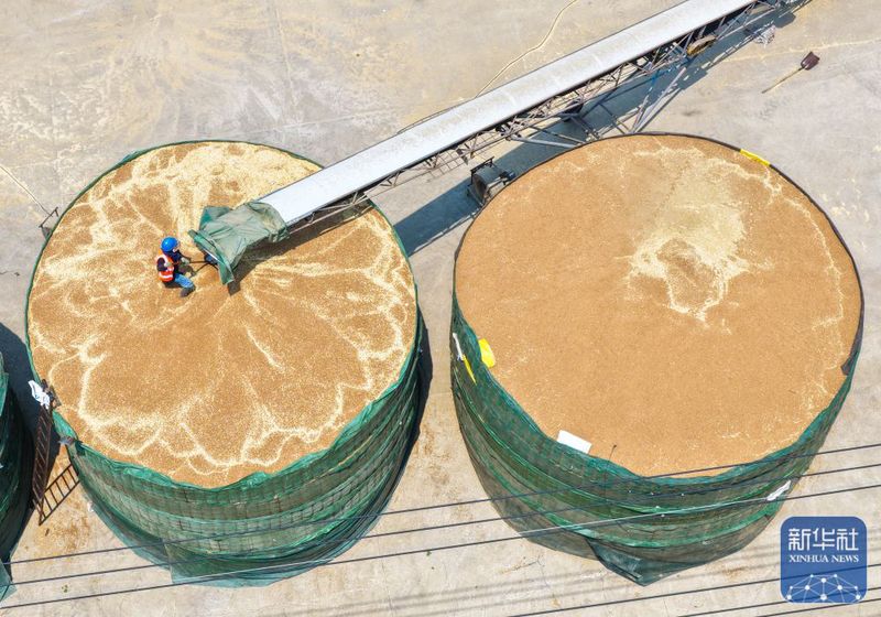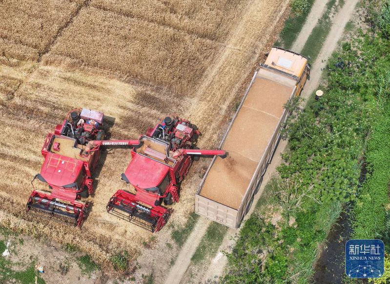 三河農(nóng)場收獲的小麥進入大華種業(yè)三河分公司存儲(5月28日攝,無人機照片)。新華社記者 季春鵬 攝