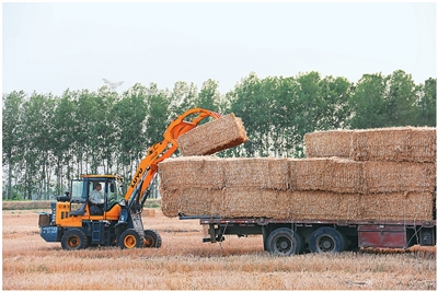 在江蘇省連云港市海州區(qū)的江蘇農(nóng)墾崗埠農(nóng)場,農(nóng)民在田間打捆回收小麥秸稈,進(jìn)行集中轉(zhuǎn)運(yùn)堆放。
