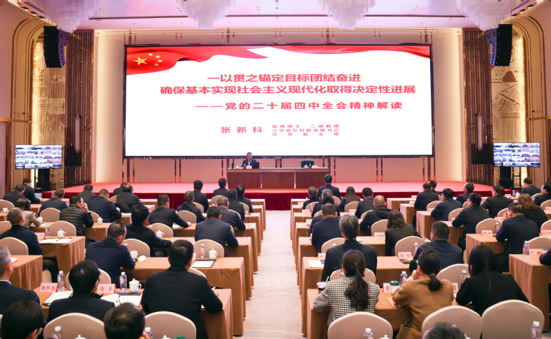 報告會上,張新科圍繞學(xué)習(xí)貫徹習(xí)近平總書記在黨的二十屆四中全會上的重要講話精神和全會《建議》,從深刻認(rèn)識黨的二十屆四中全會的重大意義,準(zhǔn)確把握“十五五”時期在基本實(shí)現(xiàn)社會主義現(xiàn)代化進(jìn)程中的重要地位,全面理解“十五五”時期經(jīng)濟(jì)社會發(fā)展的戰(zhàn)略任務(wù)和重大舉措等方面,結(jié)合我國經(jīng)濟(jì)社會發(fā)展實(shí)際情況,運(yùn)用生動案例和翔實(shí)數(shù)據(jù),進(jìn)行了系統(tǒng)闡釋和全面解讀。他指出,全會取得的重大成果、作出的重大部署,充分體現(xiàn)了以習(xí)近平同志為核心的黨中央團(tuán)結(jié)帶領(lǐng)全黨全國各族人民續(xù)寫經(jīng)濟(jì)快速發(fā)展和社會長期穩(wěn)定兩大奇跡新篇章、奮力開創(chuàng)中國式現(xiàn)代化建設(shè)新局面的歷史主動,必將對黨和國家事業(yè)發(fā)展產(chǎn)生重大而深遠(yuǎn)的影響。要把學(xué)習(xí)貫徹全會精神同學(xué)習(xí)領(lǐng)會習(xí)近平新時代中國特色社會主義思想貫通起來,結(jié)合習(xí)近平總書記對江蘇工作重要講話精神,做到學(xué)深悟透、狠抓落實(shí),奮力譜寫“強(qiáng)富美高”新江蘇現(xiàn)代化建設(shè)新篇章。