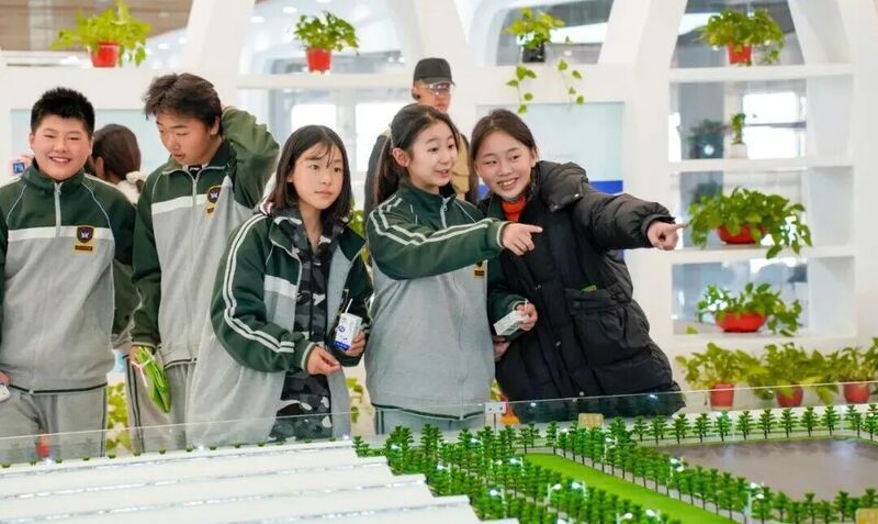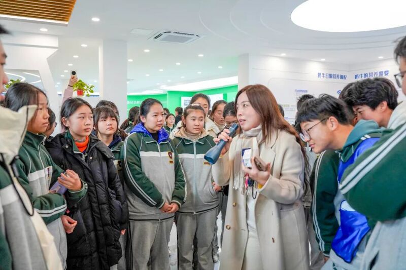“原來奶牛是這樣擠奶的!太神奇了……”在可視化擠奶廳里,師生們的驚嘆聲此起彼伏。兩座全自動(dòng)轉(zhuǎn)盤式利拉伐擠奶機(jī)正在運(yùn)轉(zhuǎn),一頭頭黑白花奶牛有序走上轉(zhuǎn)盤,擠奶員則熟練地進(jìn)行著前藥浴、驗(yàn)?zāi)?、套杯、后藥浴等?biāo)準(zhǔn)化操作,整個(gè)流程清晰直觀地呈現(xiàn)在眾人眼前?!袄蠋?,這些奶牛每天能產(chǎn)多少奶呀?”一名戴眼鏡的男生舉手提問。講解員小張笑著解答:“一頭牛最高可以產(chǎn)70公斤牛奶,產(chǎn)出的牛奶都要經(jīng)過100多項(xiàng)指標(biāo)檢測(cè),達(dá)標(biāo)合格后才能走向市場(chǎng)?!痹谥腔刍鷳B(tài)展廳,師生們既能通過圖文展板系統(tǒng)學(xué)習(xí)奶牛品種特性、科學(xué)飼養(yǎng)方法及飼料配方等基礎(chǔ)知識(shí),又能通過蘇墾乳業(yè)數(shù)字牧場(chǎng)展示平臺(tái)實(shí)時(shí)查看每頭奶牛的身份檔案、生長曲線、產(chǎn)奶數(shù)據(jù)及健康監(jiān)測(cè)指標(biāo),沉浸式感受科技為傳統(tǒng)養(yǎng)殖業(yè)帶來的變革?!斑@次研學(xué)真是讓我親眼看到了科技養(yǎng)牛的力量,原來一杯好牛奶的誕生背后,藏著這么多學(xué)問!”一位帶隊(duì)老師感慨道。