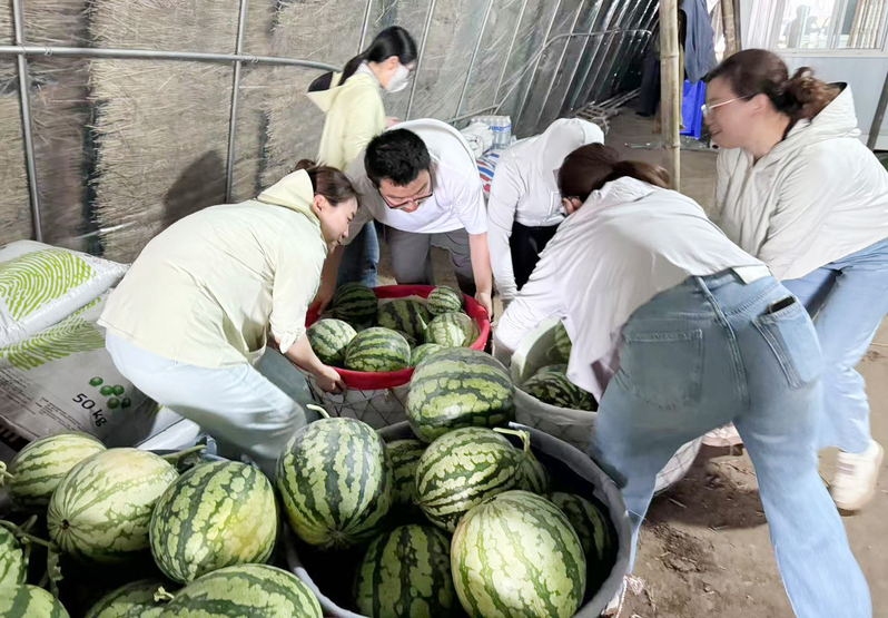 “產業(yè)中心急需支援!”6月12日下午3點,東壩頭農場工作群消息剛彈出,20多名農場機關青年已沖向西瓜地。烏云壓頂,一場與暴雨的賽跑就此展開。在6大隊15號田地里,青綠的西瓜藤蔓間閃動著忙碌的身影。男同志們喊著號子將沉甸甸的瓜筐抬上三輪車,女同志們抱著10多斤的西瓜接力傳遞?!拜p點放!”“這邊再來一筐!”產業(yè)發(fā)展中心龔玲玲的提醒混著此起彼伏的應答聲。此時的天空已開始飄落淅淅瀝瀝的雨絲,泥水濺上褲腿,汗珠滾落臉頰,54筐西瓜在40分鐘內全部安全入倉。“咱們這速度,能拍動作片了!”負責裝車的王瑋琦抹著汗笑道。豆粒大的雨點終于砸了下來,這群年輕人相視而笑,沾滿泥點的鞋子在田埂上留下一串深深淺淺的印記。