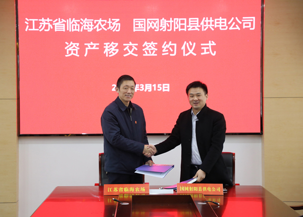 3月15日,江蘇省臨海農(nóng)場與國網(wǎng)江蘇省電力有限公司射陽縣供電分公司在農(nóng)場綜合樓七樓會議室舉行電力資產(chǎn)移交簽約儀式,農(nóng)場黨委書記、場長賀在銳,射陽縣供電分公司總經(jīng)理王愛軍在資產(chǎn)移交協(xié)議上簽字,標志著農(nóng)場分離辦社會職能改革進入實質(zhì)性階段。