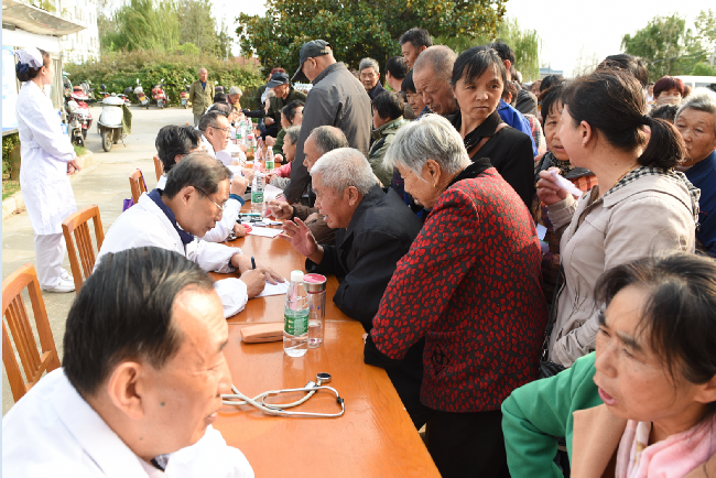 下午2點(diǎn)鐘開(kāi)始,在淮海農(nóng)場(chǎng)門診大樓門前,來(lái)自揚(yáng)州大學(xué)普外科常見(jiàn)病、多發(fā)病和疑難危重疾病的診治專家,醫(yī)學(xué)博士,外科學(xué)教授、主治醫(yī)師張培健;內(nèi)分泌科專家教授、主任醫(yī)師丁立;呼吸內(nèi)科主任醫(yī)師蔣有娟;心血管內(nèi)科副主任醫(yī)師嚴(yán)俊峰;揚(yáng)州大學(xué)副教授,蘇北人民醫(yī)院中醫(yī)科主任醫(yī)師,中醫(yī)內(nèi)、兒科專家孫保生;中醫(yī)科主任醫(yī)師,骨科專家李寧;心理學(xué)副教授王慧和副教授、附屬醫(yī)院神經(jīng)外科主任醫(yī)師武永康等8名離退休專家一字排開(kāi),端坐在條桌前,拉開(kāi)了為淮海農(nóng)場(chǎng)社區(qū)的廣大職工居民開(kāi)展義診活動(dòng)的帷幕。