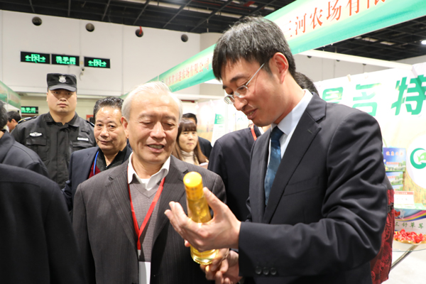 交易會(huì)開幕當(dāng)日,江蘇省農(nóng)業(yè)農(nóng)村工作領(lǐng)導(dǎo)小組副組長胥愛貴等領(lǐng)導(dǎo)巡館來到江蘇農(nóng)墾展館,在集團(tuán)公司企劃部負(fù)責(zé)人和朱明亮的陪同下,專程到臨海農(nóng)場(chǎng)公司展位調(diào)研指導(dǎo)。朱明亮向領(lǐng)導(dǎo)介紹,近年來農(nóng)場(chǎng)公司按照省委和集團(tuán)公司黨委的統(tǒng)一部署,利用資源和組織化優(yōu)勢(shì),推進(jìn)企業(yè)高質(zhì)量發(fā)展,推動(dòng)產(chǎn)業(yè)提檔升級(jí),塑造生態(tài)健康農(nóng)副產(chǎn)品??梢陨缘慕】涤?ldquo;綠農(nóng)園”牌牡丹籽油就是公司推出的優(yōu)質(zhì)精品之一。胥愛貴說,知道臨海農(nóng)場(chǎng)在射陽縣境內(nèi),對(duì)臨海農(nóng)場(chǎng)公司種植油用牡丹、發(fā)展牡丹籽油產(chǎn)業(yè)的情況有所了解。他指出,江蘇農(nóng)墾及臨海農(nóng)場(chǎng)公司要在推進(jìn)現(xiàn)代農(nóng)業(yè)建設(shè)和推進(jìn)質(zhì)量可追溯的健康農(nóng)副產(chǎn)品方面發(fā)揮示范引領(lǐng)作用;要通過交易會(huì)這個(gè)平臺(tái),推出更多、更好的優(yōu)質(zhì)農(nóng)副產(chǎn)品給上海大眾,展示江蘇現(xiàn)代農(nóng)業(yè)發(fā)展的成就,讓上海各界人士更好地了解江蘇及品味江蘇優(yōu)質(zhì)農(nóng)產(chǎn)品。一同參加巡館的江蘇省糧食局夏春勝局長詳細(xì)詢問了“綠農(nóng)園”牌牡丹籽油的種植、生產(chǎn)、品牌開發(fā)及經(jīng)營銷售等情況。