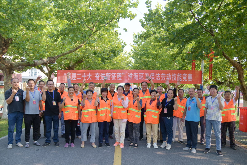 下午3點整,在“‘建功十四五 奮進新征程’淮海環(huán)衛(wèi)保潔勞動技能競賽”的條幅下,環(huán)衛(wèi)工人身著鮮艷的工作服集結(jié)在比賽現(xiàn)場,參賽人員以飽滿的熱情和躍躍欲試的態(tài)度,準備在賽場上施展身手。