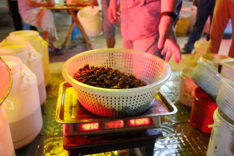 夏夜暑熱退去,新曹農(nóng)場河邊林帶、國道兩側(cè)、集鎮(zhèn)周邊,小樹林里經(jīng)常光影搖曳、星星點(diǎn)點(diǎn),人們拿著手電筒等照明裝備仔細(xì)在每棵樹上尋摸,只為找到獨(dú)屬夏季的舌尖美味——金蟬。老百姓熱衷抓蟬、吃蟬,價(jià)格由最初的每只0.3元到如今的每只1元左右,10年內(nèi)小小金蟬身價(jià)翻了3倍,一躍成為新的致富“頂流”。“金蟬捕捉高峰期能有20多天,一家人一晚可以捉1000多元,每年靠捉金蟬就有近2萬元的收益,我們這一個(gè)點(diǎn)一晚收購數(shù)量在5000斤以上,平均價(jià)每斤90元以上,年產(chǎn)值900萬元?!苯鹣s收購點(diǎn)老板何成剛說。