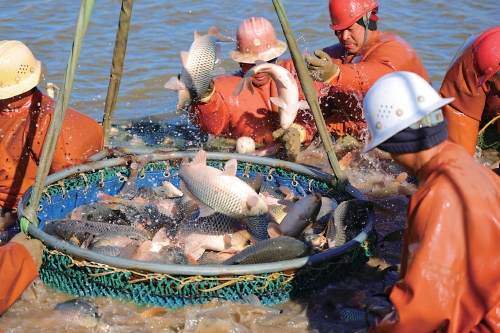隨著2026年元旦臨近,水產市場需求量逐漸增大,江蘇省連云港市海州區(qū)積極做好鮮魚捕撈銷售工作,切實滿足節(jié)日市場需求。圖為海州區(qū)的江蘇農墾崗埠農場加緊拉網(wǎng)捕撈鯉魚、花鰱、白鰱等各種鮮魚,準備供應云南昆明、山東濟寧等多地市場。 徐衛(wèi) 攝
